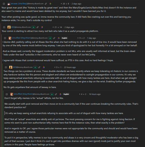 arrow-up122arrow-down1imageDbzer0 admins have a little fight where db0 tells a user that they're attracting too many tankies (exactly like I did to db0). They wonder why tankies are given more leeway than liberals sh.itjust.worksgoat@sh.itjust.worksM to MeanwhileOnGrad@sh.itjust.worksEnglish · 3 months agomessage-square42linkfedilink