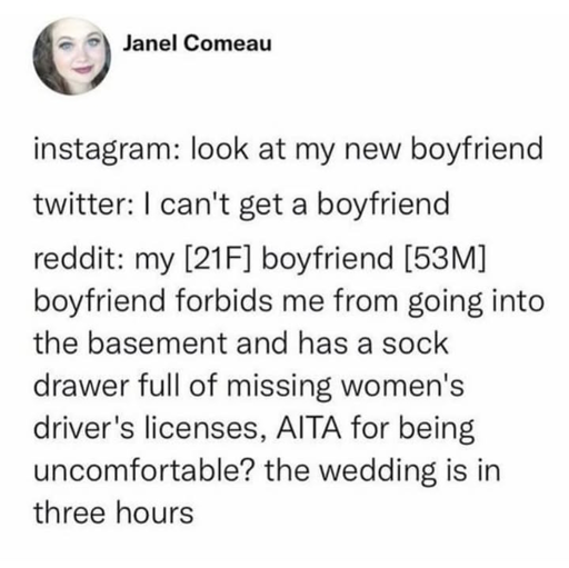 minus-squaremavu@discuss.tchncs.delinkfedilinkarrow-up50arrow-down1·1 day agoMastodon: My boyfriend is on his period, and needs distracting, anyone know a good show i can put on my Jellyfin media server? BlueSky: I did once have a girlfriend, but we seperated amicably.