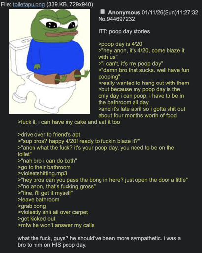 It’s also pretty unrealistic, just biologically/medically. Most people need to have their poop day once per month, if not once per week.