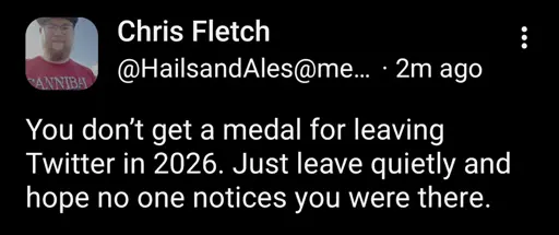 Since it’s clear shame isn’t working I’ll happily congratulate anywho leaves Twitter in 2026. Late to the party is better than never.