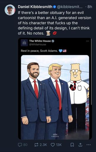 As someone who remembers Dilbert as one of the biggest players on the comics page of 1990s newspapers and loved the strips (even though as a kid I didn’t really appreciate a lot of the office humor), this hits hard on so many levels. Scott Adams, you could have stayed a great, but now your legacy is that of a MAGA loser with an AI obituary.