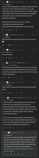 Further down the thread, the dude spoke positively of Stalin and went as far as to call Khrustchev revisionist. Also a lot of imperialism and russification was continued under Stalin. That is also the point. Lenin may not have done it, but his successors did.