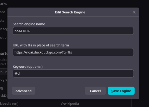 DDG has a noAI portal that filters out AI images and doesn’t bother you with summations and things. it’s available at noai.duckduckgo.com and you can add it as a separate search engine to Firefox thusly.