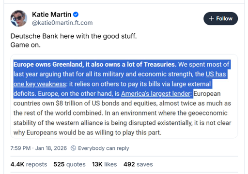 Yeah, same with Canada. We have about 430 billion in US debt. Admittedly not as much as Europe, but still a big chunk. And it was Carney that suggested other countries consider dumping this debt if tarifs went out of control.