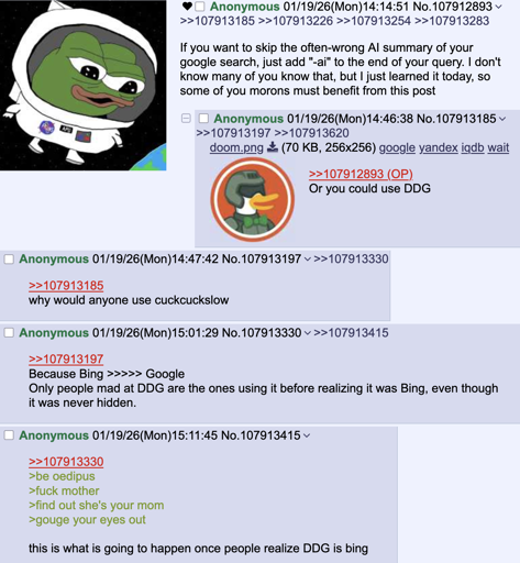 There was also a big thing about DDG allegedly selling user data to Microsoft, which the living brain donors of 4chan probably interpreted as DDG being a different front-end to Bing.