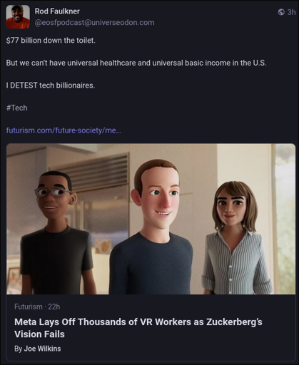 Note that this was a 10% cut. Meta has a lot of staff. They are also slightly pivoting to AR glasses, as they say Ray-Ban Display sales are much higher than anticipated. I think they see their chance of cornering the VR market as gone (probably because of android xr) (see https://www.uploadvr.com/meta-pauses-third-party-horizon-os-headsets/ ) but think they have a chance to dominate AR glasses / wearables.