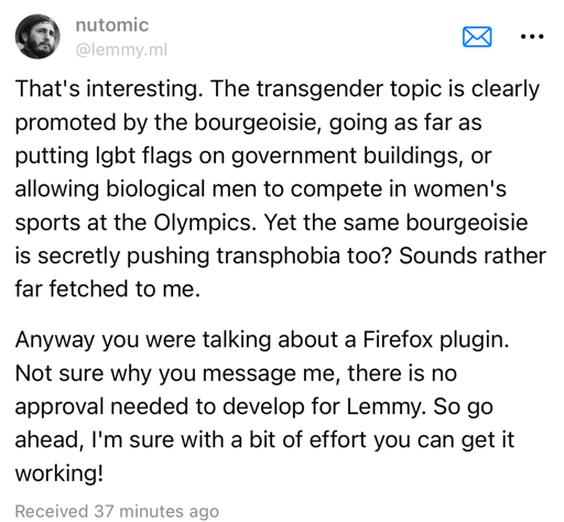 arrow-up169arrow-down1image[Transphobia Warning] Nutomic’s Stance on Transgender Peoplepinlemmy.caPugJesus@lemmy.world to MeanwhileOnGrad@sh.itjust.worksEnglish · 2 years agomessage-square75linkfedilinkcross-posted to: tankiejerk@lemmy.worldfediverse@lemmy.world
