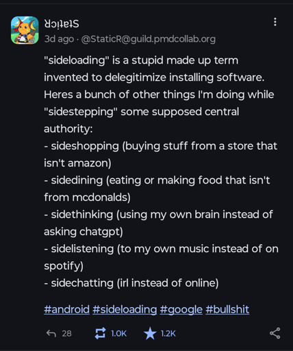 I’m not sideloading an app onto my desktop when I download an appx file from GitHub to install something instead of using the windows store, having a special term for installing an apk file outside the play store just obscures what’s happening