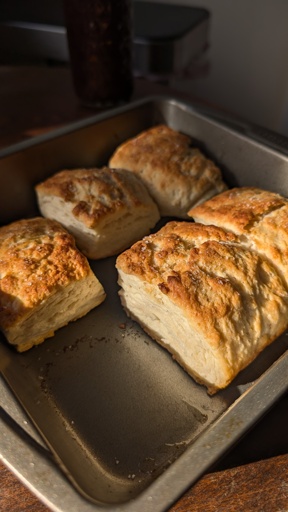 Add flour, sugar, baking powder and salt to bowl. Take your very cold butter, and grate it into the dry ingredients using a box grater. Quickly work the butter into the flour mix with a fork or your hands. Add a portion of the milk, and mix until a shaggy dough forms, adding more milk as necessary (I did not use the full allotment). Turn out onto a work surface dusted with flour. Knead with your hands until you have a solid mass which does not stick to your work surface. Roll it into a rough ball/lump, then flatten it out into a rough rectangle approximately 1 inch thick. Fold one half of the rectangle on top of the other half, and then knead it back out to a 1 thick rectangle. Turn the dough 90 degrees, and repeat a couple times. I think I maybe did 5 reps. Once you have your final rectangle, cut out your biscuit rounds if you have the tool to do so. I did not, so I just cut the rectangle into thirds and then half using a chef’s knife. Lubed a baking pan with cooking spray, hucked the bits of dough in, and set into a 425 degree F (~220 C) oven. Baked until the dough had puffed up at least twice it’s initial size, and the surface was dry and unyielding to my finger (roughly 15, 20 min? I don’t know, tbh, this was all feel at this point). Notably, the biscuits had not acquired much of any color other than their bottoms. I was worried about over cooking them or scorching the bottoms if I let it go until the tops were golden brown, so I brushed them down with butter and then hit em with a full broiler grill fro several minutes, until the coloration seen here was achieved. Reapplied more melted butter, cracked over some fresh salt, and voila.