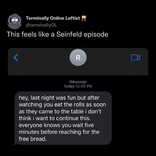 minus-squarethesohoriots@lemmy.worldlinkfedilinkEnglisharrow-up14·6 days ago“We have a rule, if you order the nachos to share, one person can’t just eat all the fully loaded nachos.”