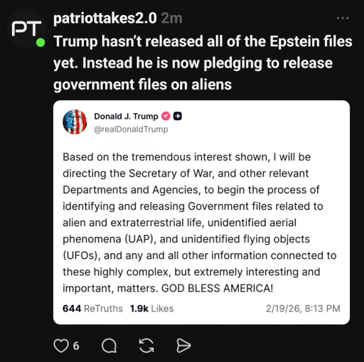 arrow-up11.01Karrow-down1imageThis MF is quadrupling down and dropping Alien files before dropping the full, unredacted Epstein Files. GODDAMN.lemmy.worldMTZ@lemmy.world to Lemmy Shitpost@lemmy.world · 3 days agomessage-square213linkfedilinkcross-posted to: politicalmemes@lemmy.world