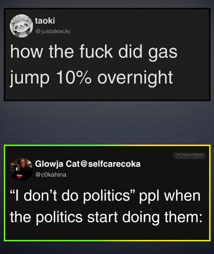 Knowing about naked corporate greed being the source of 2/3rds of all inflation since 2020 is also politics. (The remaining third is due to input costs rising.)