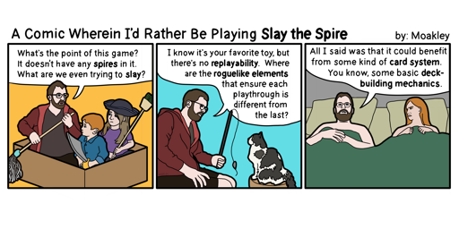 Wow, that’s pretty incredible that it hadn’t reached you all these years. Slay the Spire’s predecessor is Dream Quest, which, in combination with the tabletop card game Dominion, spawned a whole subgenre of deck-building games.