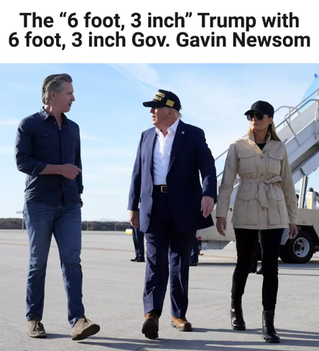 Im not saying Trump is 6’3*, he’s clearly not. I myself have shrunk over an inch and I’m younger than him by a generation. But people don’t always measure the same, or try to. I have a friend who is 6’1" who swears he’s 5’11". He never stands up straight. At my tallest I was 5’11 3/4" and you better believe I was giving my measurements all I could hoping I’d get to 6’. My guess is Trump once was 6’3", has shrunk to just a little over 6’, and Newsom is probably closer to 6’4". But without putting a measuring tape to them, what the hell do any of us know?