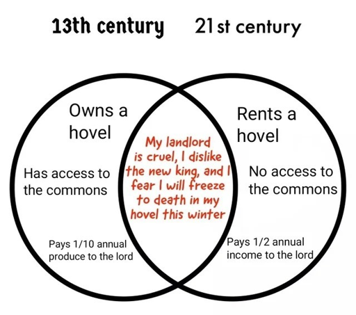 The point of the meme is that a modern-day wage labourer is exploited way more than a medieval wage labourer. There’s nothing there about famines, plagues and wars (which by the way only went away from Europe to an extend for the past 80 years, and there’s no guarantee that they’ll be staying away).