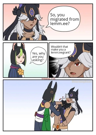 Just to give you some context: Tighnari (with the green piece of cloth) is choking Cyno because he is swamping him with bad jokes day in and day out. So this is not a joke about immigrants, they are receiving absolutly horrible treatment in A LOT of cases but a mere pun just like Cyno would do it.