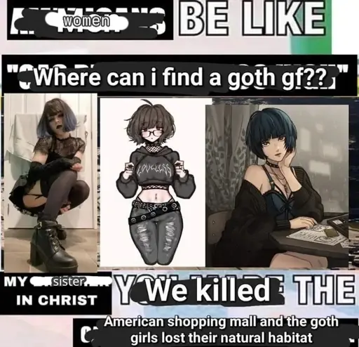 transcription: women be like “where can i find a goth gf?” my sister in christ we killed the american shopping mall and the goth girls lost their natural habitat