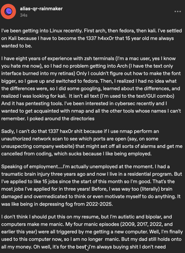 The honest to god truth is that I grew up with PCs, then switched to Mac in 2017. Still have a mac but now I am a linuxbro as well.