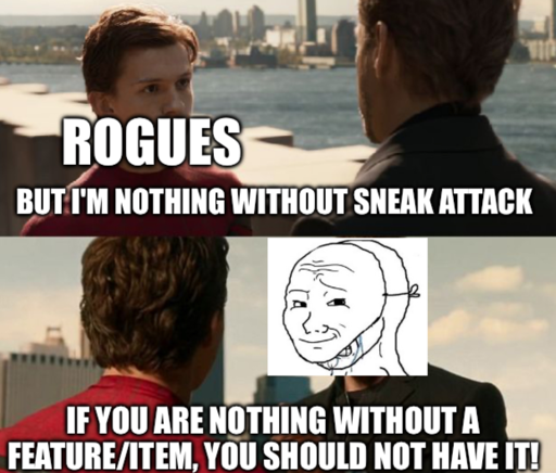 RPGMemes @ttrpg.network•Better don’t give martials any weapons and casters no spellcasting then…