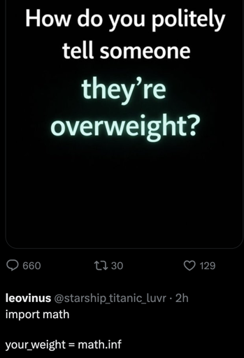 would’ve been better without “deliriously”. brevity is the soul of wit, meaning a five syllable adverb has no fucking place in any joke