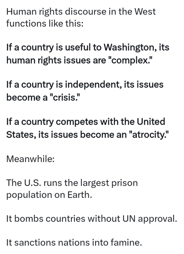 Anyway, i don’t know the perfect solution to each conflict, but what should distinguish us from the past is to avoid situations such as “the winner takes all”, in the case of Israel there should be a two-states solution eventually leading to a single state with a brotherly unity between israeli jews and arabic muslims, in the case of Venezuela they should have a control of their oil, and if they choose to accept foreign companies then it shouldn’t be the current decades-long robbery but stops e.g. at a 20% ROI, we should allow socialist/islamic/… states and other differences, and in every case we should treat others as we would like to be treated, which is obviously a laughable notion in international politics where strength(&‘narrative management’) rules supreme, a conclusion which leads to the necessity of establishing solutions such as an international army and tribunal, for example.